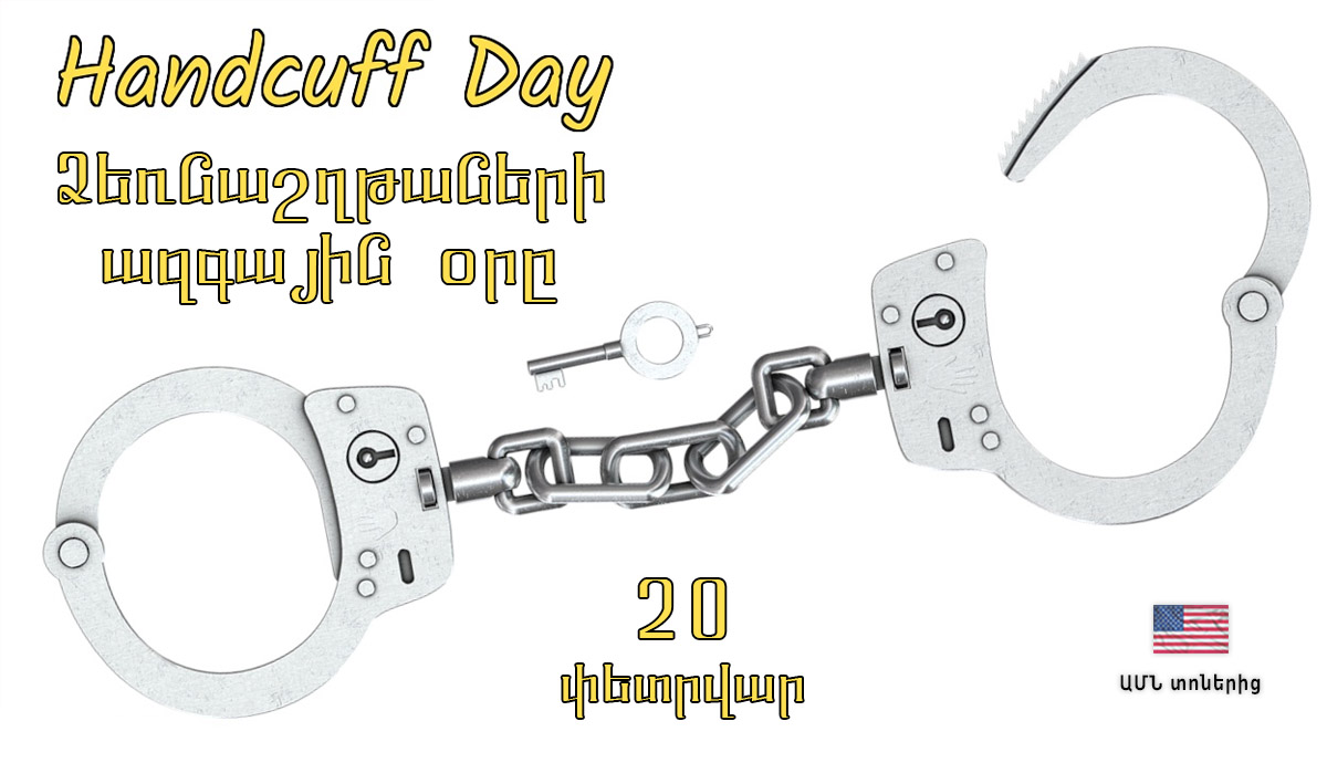 Ձեռնաշղթաների ազգային օրըՓետրվարի 20-ին ԱՄՆ-ում նշում են Ձեռնաշղթաների ազգային օրը (National Handcuff Day) Բաժին՝ Անսովոր տոներ | Դիտումներ՝ 384 | | Ամսաթիվ՝ 20.02.2024